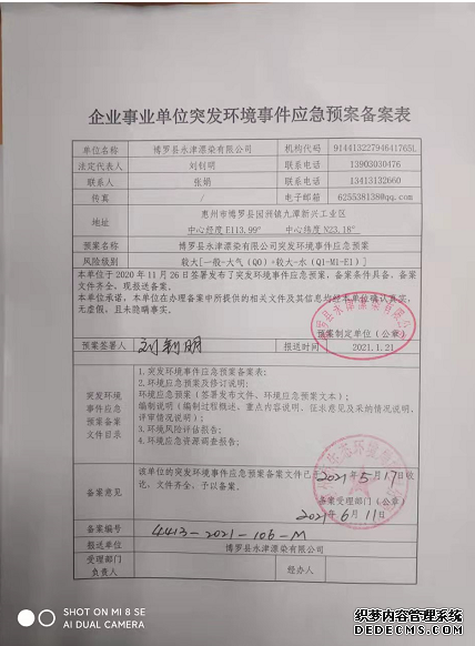 已制訂《博羅縣永津漂染有限公司環(huán)境風(fēng)險(xiǎn)評(píng)估報(bào)告》,并于2017年5月31日上報(bào)博羅縣環(huán)境保護(hù)局備案;