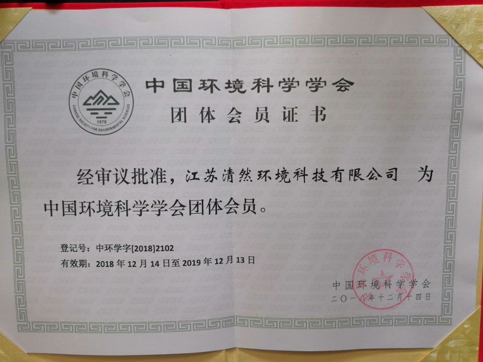 中國環(huán)境科學(xué)學(xué)會團(tuán)體會員證書:中環(huán)學(xué)字[2018]2102