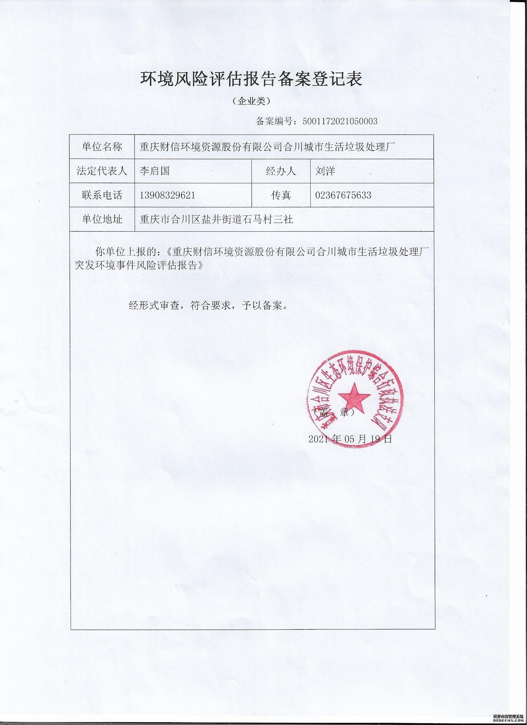 已制訂《重慶財信環(huán)境資源股份有限公司合川城市生活垃圾處理廠環(huán)境風(fēng)險評估》,并于2021年 5月20日在合川區(qū)環(huán)境保護局備案, 備案編號:5001172021050003 |